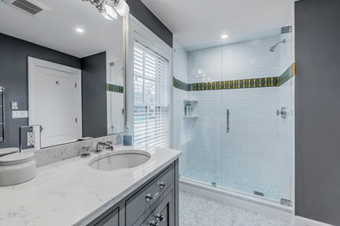 The entire renovation was completed in less than four months. According to the homeowner, “Considering all of the work that was done, this project went at lightning speed.” She continues, “We are really happy with our new space. We have a fantastic place to host guests. And in our master suite, we got height and light as well as technological upgrades like our TV and speakers. And the kids are never in our bathroom anymore!”