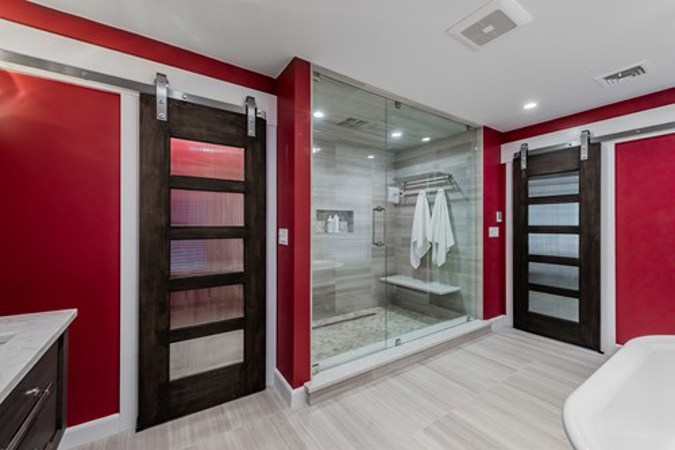 The master bathroom includes a spa tub, oversized shower and distinctive barn doors.