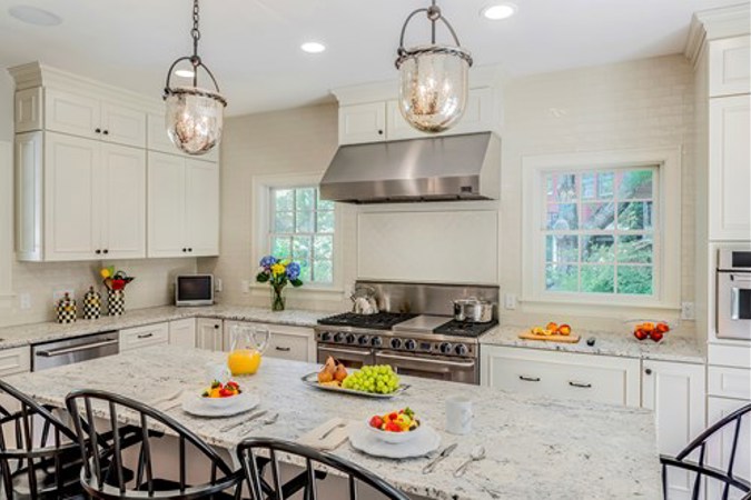 The large kitchen has gorgeous white cabinets, granite counter tops and top-of-the-line stainless appliances.
