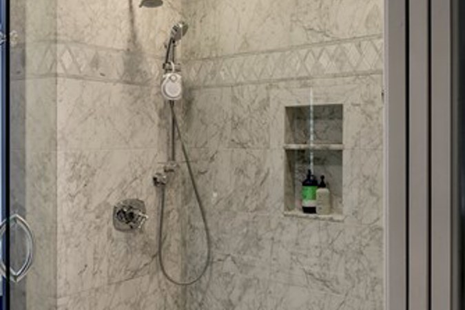 Large walk-in shower in the master bath has dual shower heads and a bench.