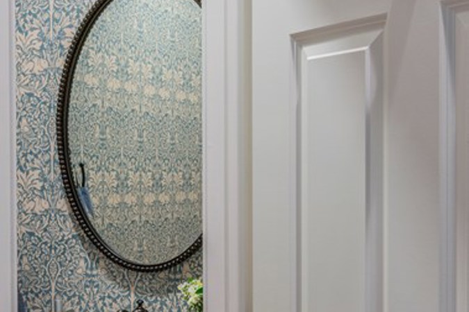 This quaint powder room has a classic look with wallpaper and oil rubbed bronze fixtures.