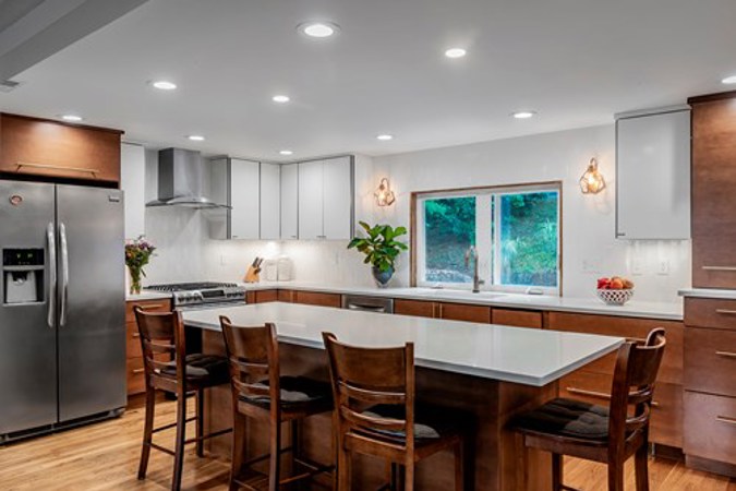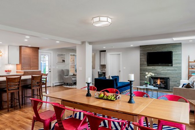In addition to adding a new garage, Sterling Homes remodeled the main living space. The updated kitchen boasts a large island that opens up into the dining and family rooms.